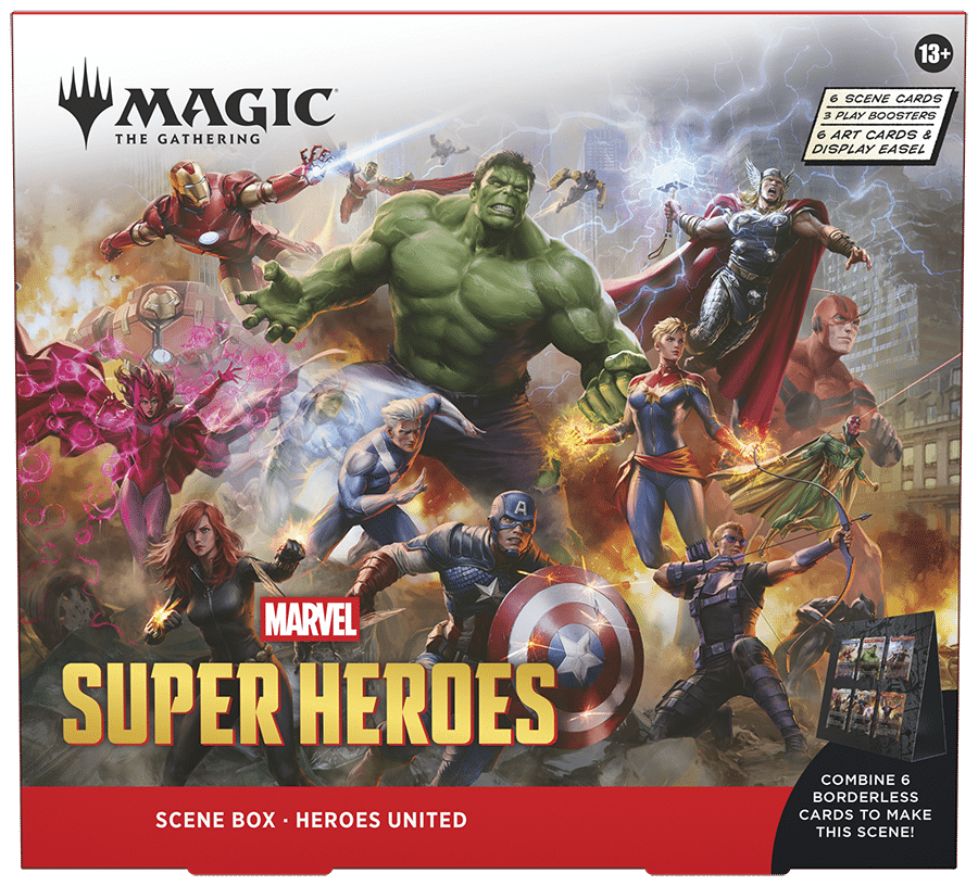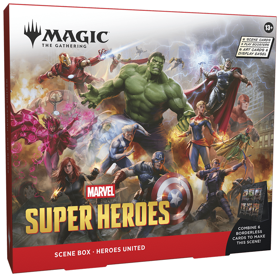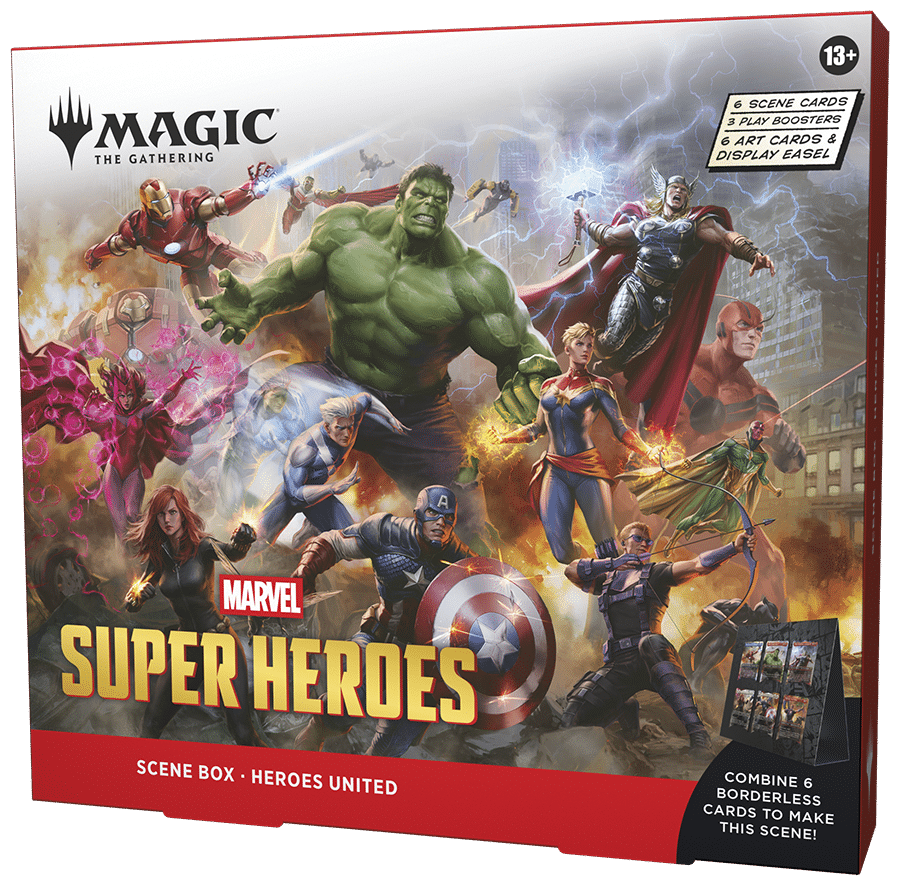 Immortala conflitti epici con una Scene Box di Magic: The Gathering | Marvel Super Heroes. Potenzia il tuo mazzo o la tua collezione con sei tradizionali carte scena foil senza bordo. Ogni carta scena è una carta di Magic giocabile (testo di gioco incluso), ma questa scatola contiene anche sei carte solo illustrate che ti permettono di ammirare la scena in tutto il suo splendore e di esporla sul cavalletto incluso! Ogni Scene Box include tre Play Booster; il modo migliore per scoprire cosa Magic ha da offrire, sono perfette per costruire mazzi, giocare con gli amici e sono divertentissime da aprire.